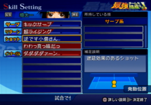 まずサーブにキックサーブを。本当はチームメイトと伝家の宝刀ツイストサーブを覚えさせたかったが、何故か選択肢になかったので次点で近いキックをチョイス。太一ってアニメでツイスト打ってた気がするし、初期搭載でも良かったのでは…と思ったが、放送時期や原作での扱いが不明瞭だったので目を瞑ろう。
